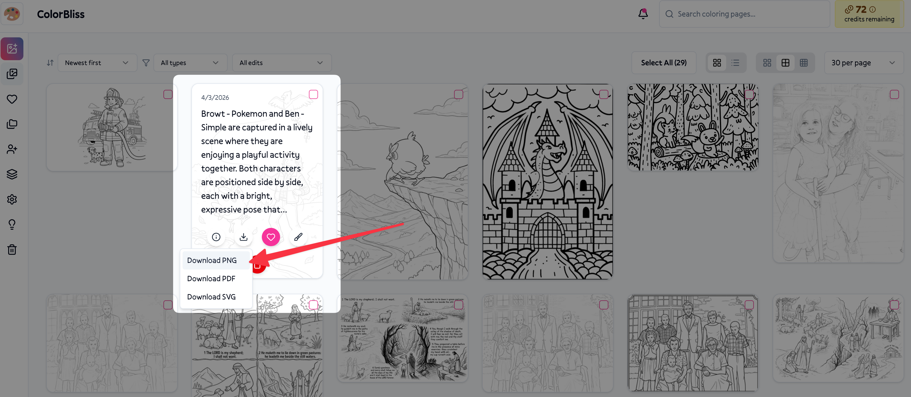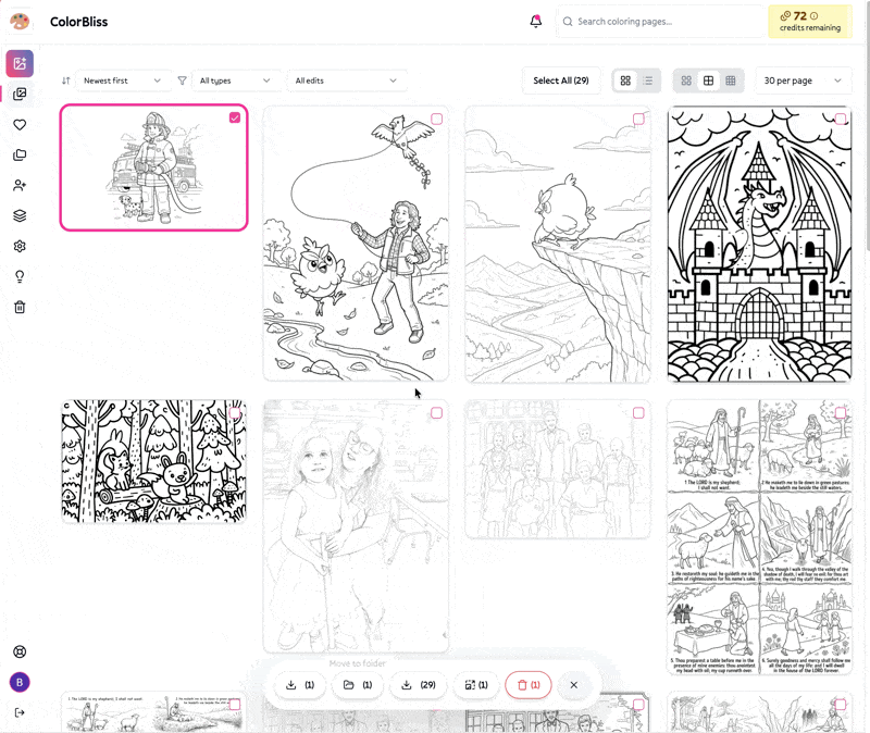 Download your first page by clicking the download icon on any coloring page card. For multiple pages, select them and use the bulk download bar. Organize pages into folders to make bulk downloads even easier.