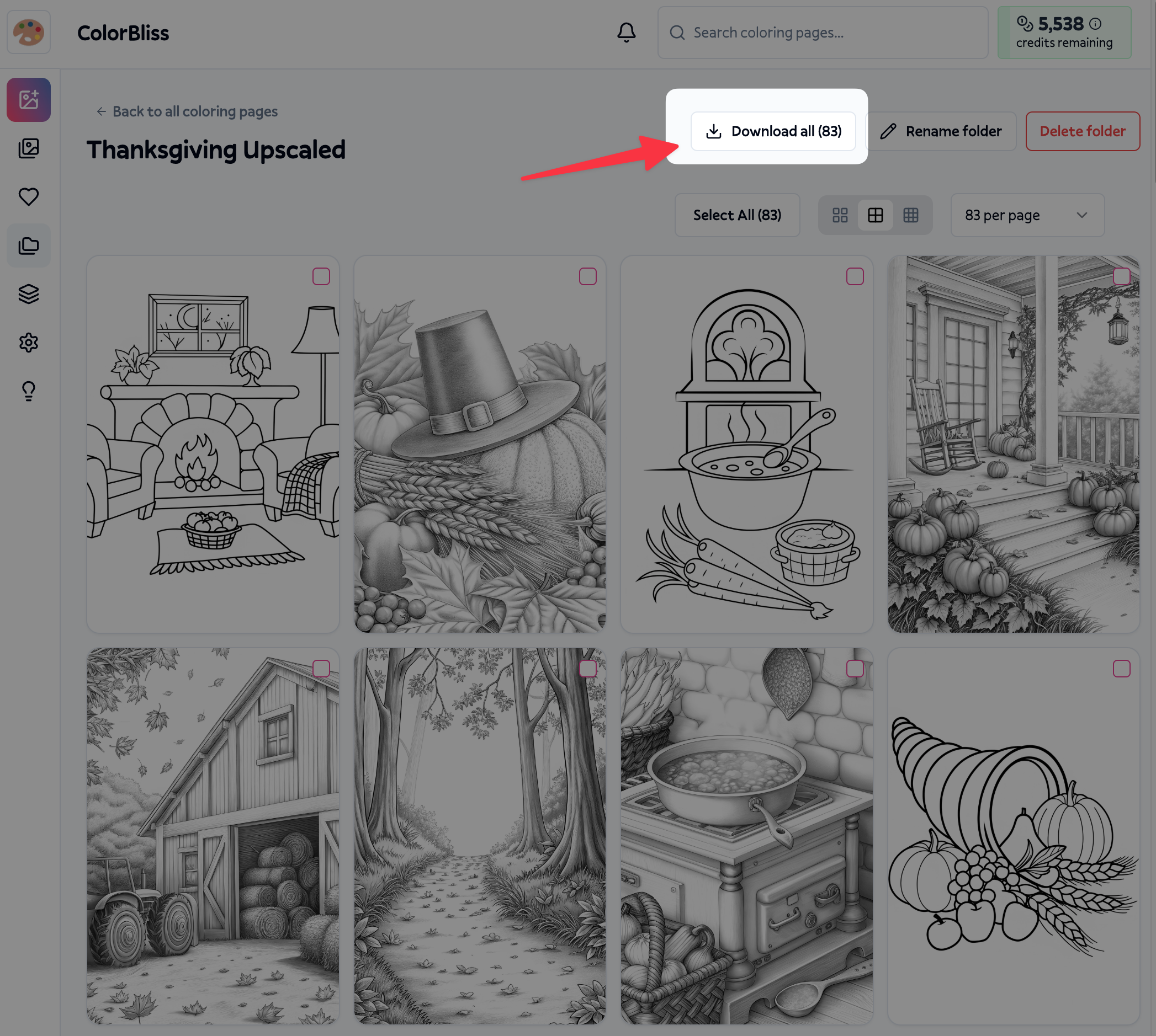 Once you're viewing folder contents, you can perform various bulk actions on your coloring pages. Select one or more pages using the checkboxes to reveal the action bar at the bottom of the screen.